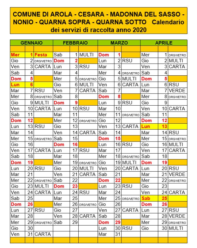 - Calendario rifiuti - anno 2020 Gennaio - Aprile[.pdf 6,1 Kb - 30/12/2019]