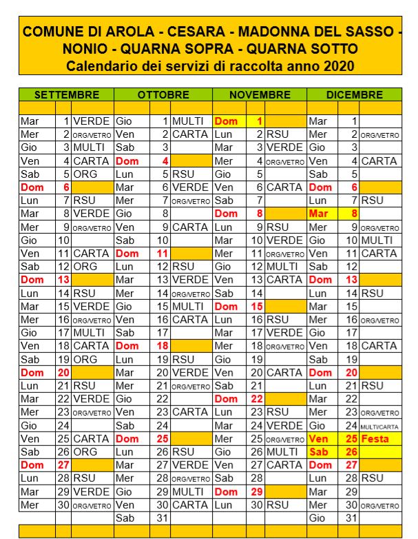 - Calendario rifiuti - anno 2020 Settembre - Dicembre[.pdf 6,26 Kb - 30/12/2019]