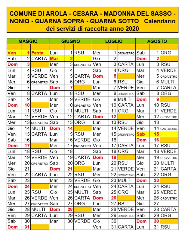 - Calendario rifiuti - anno 2020 Maggio - Agosto[.pdf 6,19 Kb - 30/12/2019]